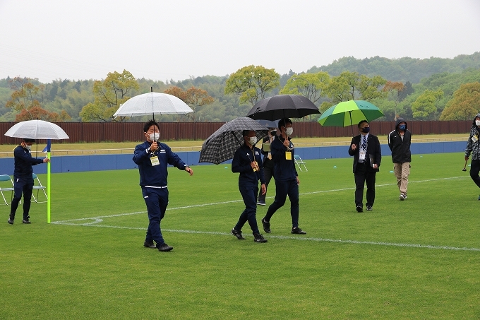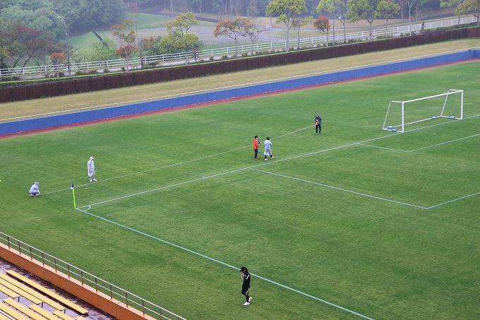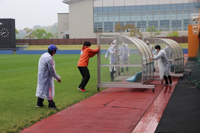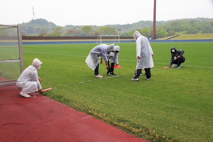 キックオフ90分前にはマッチコミッショナー、審判団、運営関係者によりピッチ点検を行います