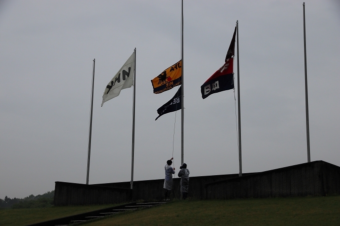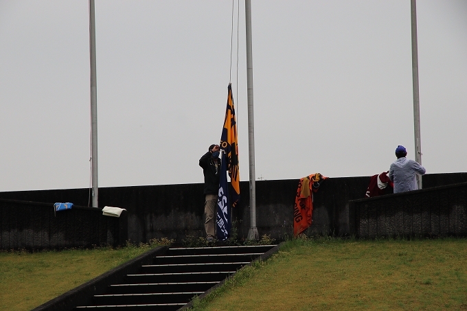協会旗、協賛社様の旗の掲揚です 掲揚ポール、順番も決まっています