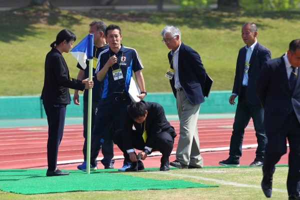 試合前マッチコミッショナー及び審判団、運営側でピッチチェックです