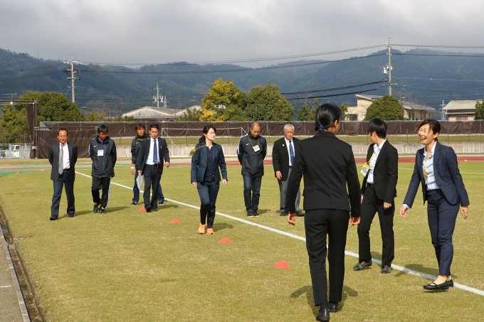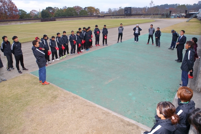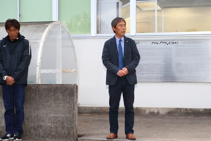 試合が終わってホッとする川瀬委員と神村学園伊賀分校サッカー部の先生と選手
