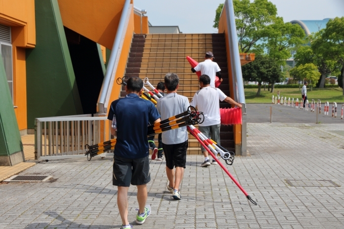 観客席へ記者席、カメラ用のスペース等を作りに行って頂きました