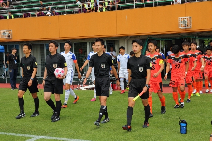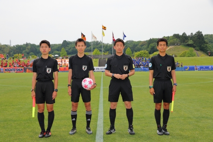 主審 松澤 慶和氏(右から二人目)、A1日比野 真氏(右端)、A2高橋 大輝氏(左端)、第4の審判員 中島 俊介氏