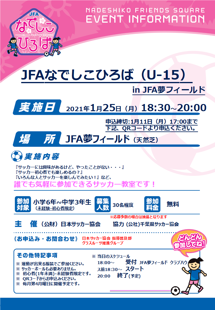 JFAなでしこひろばを2021年1月25日(月)に、高円宮記念JFA夢フィールドで開催します。