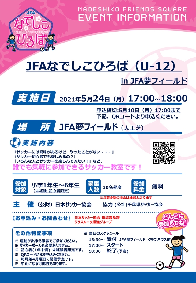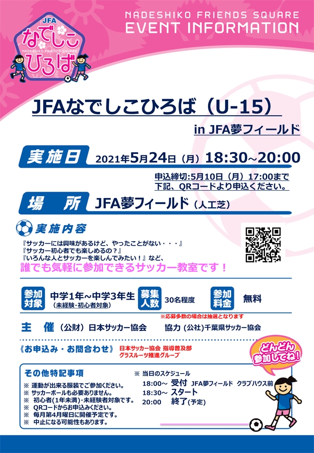 JFAなでしこひろばを2021年5月24日(月)に、高円宮記念JFA夢フィールドで開催します。