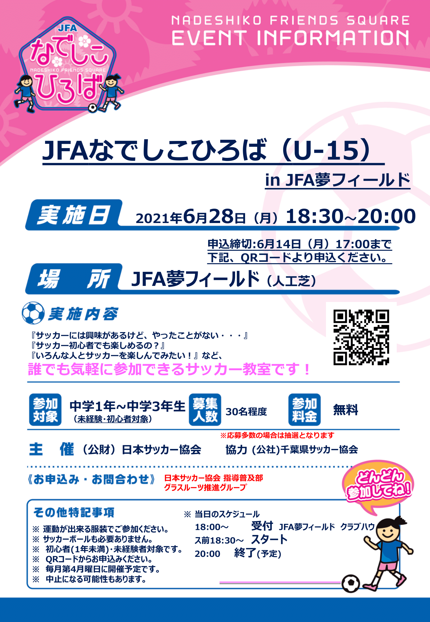 ※6月28日(月)に開催を予定しておりました「JFAなでしこひろば」は、新型コロナウイルス感染拡大状況を鑑み、中止することといたしました。イベントを楽しみにしてくださっていた皆様には大変申し訳ございませんが、何卒ご理解いただきますようお願いいたします。