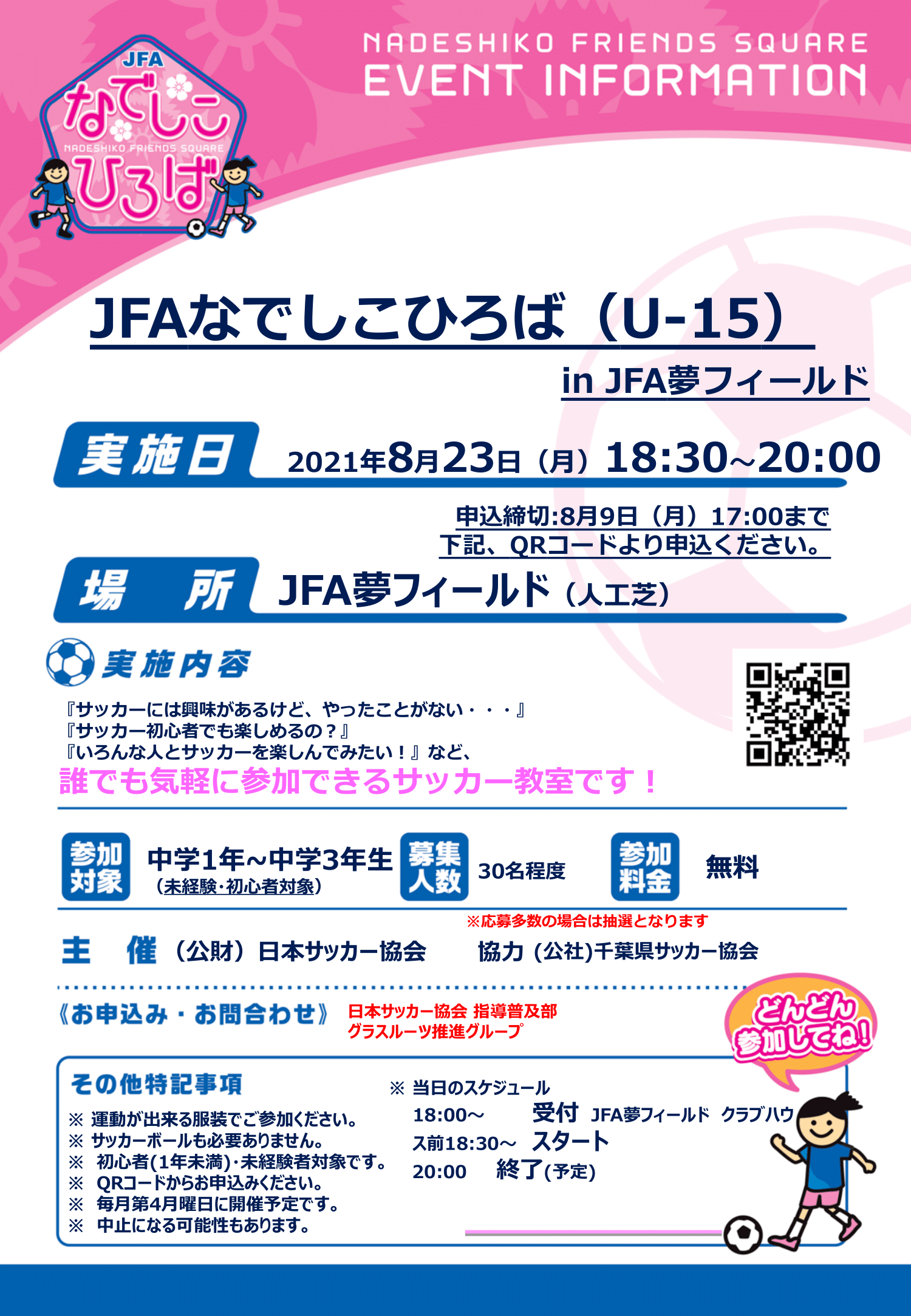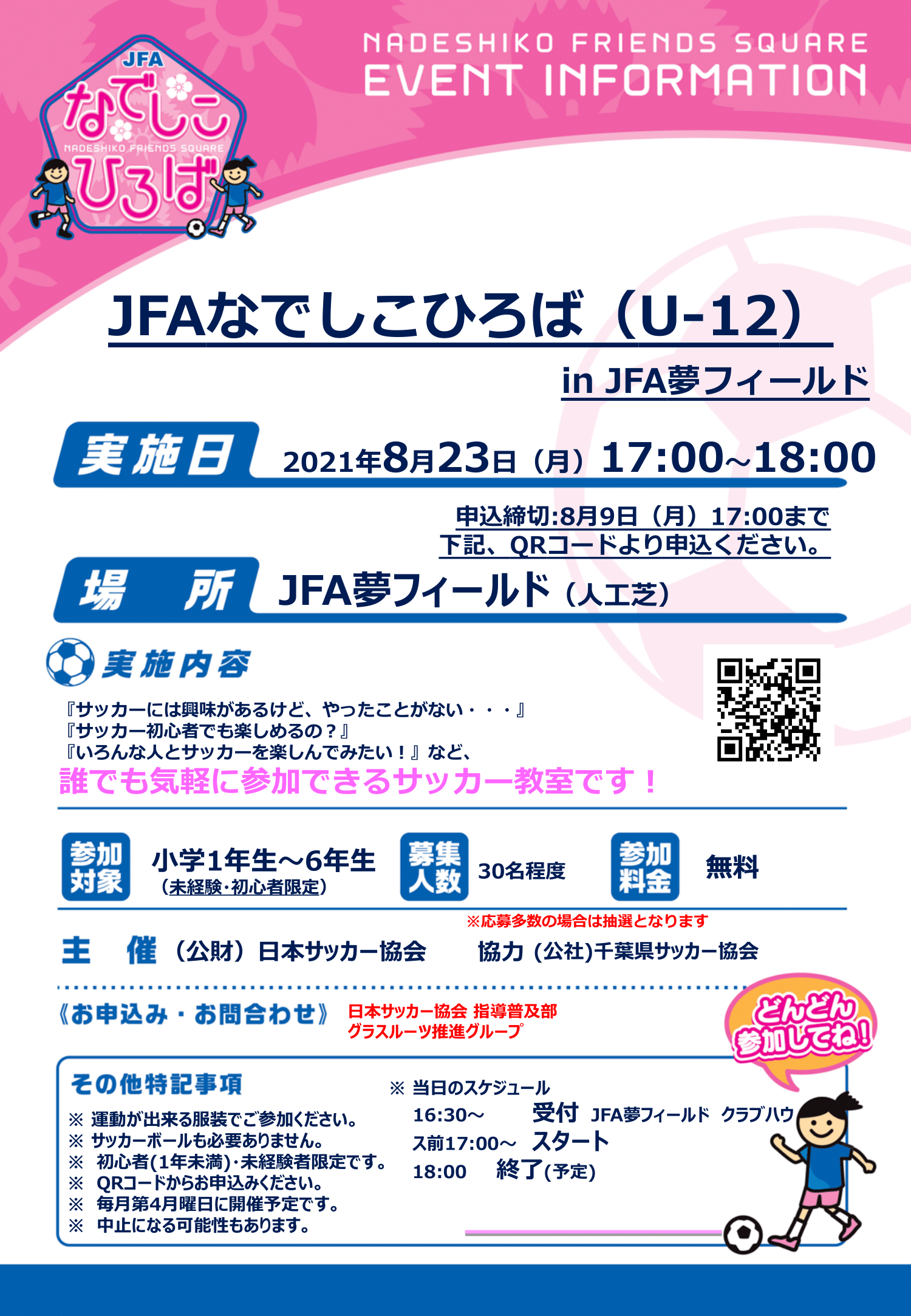 JFAなでしこひろばを2021年8月23日(月)に、高円宮記念JFA夢フィールドで開催します。