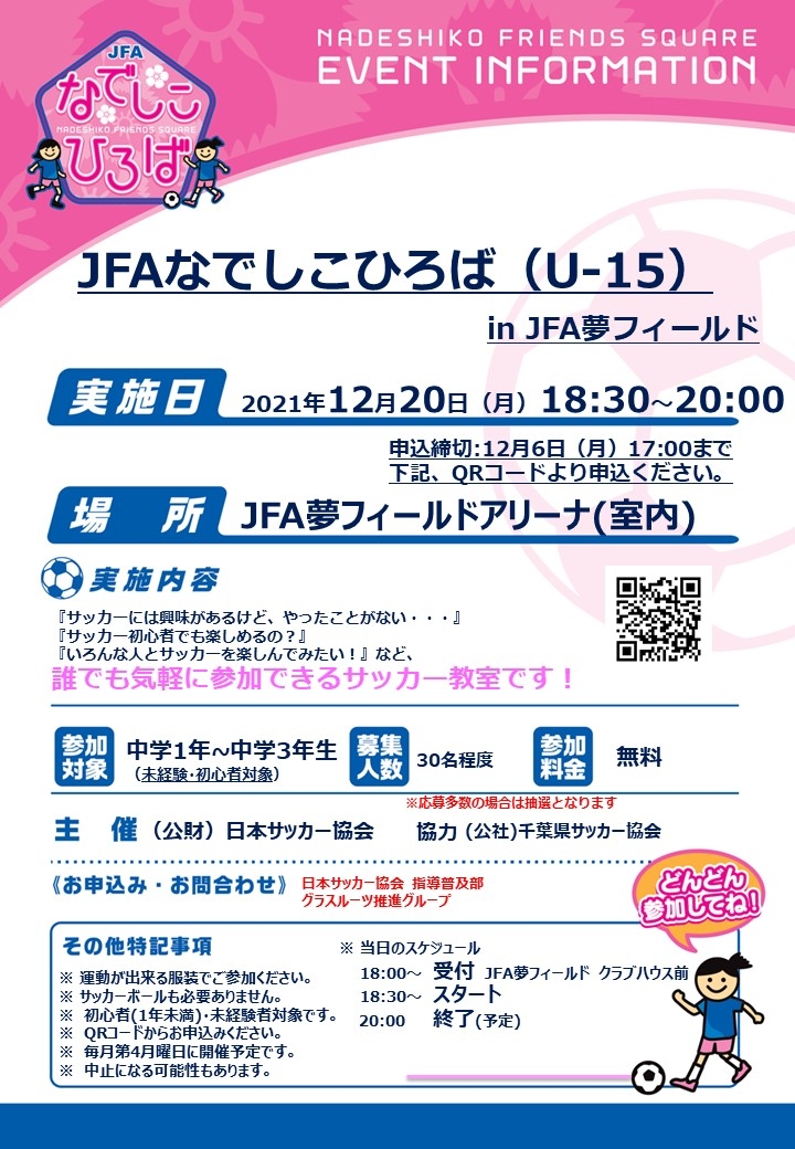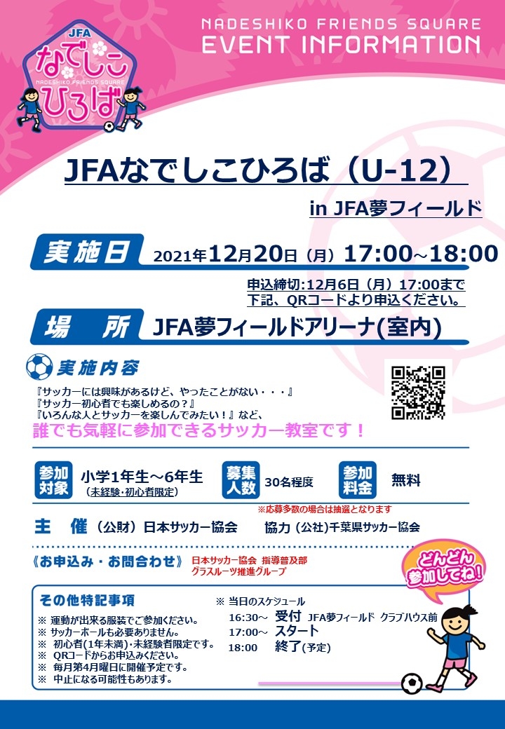 JFAなでしこひろばを2021年12月20日(月)に、高円宮記念JFA夢フィールドで開催します。
