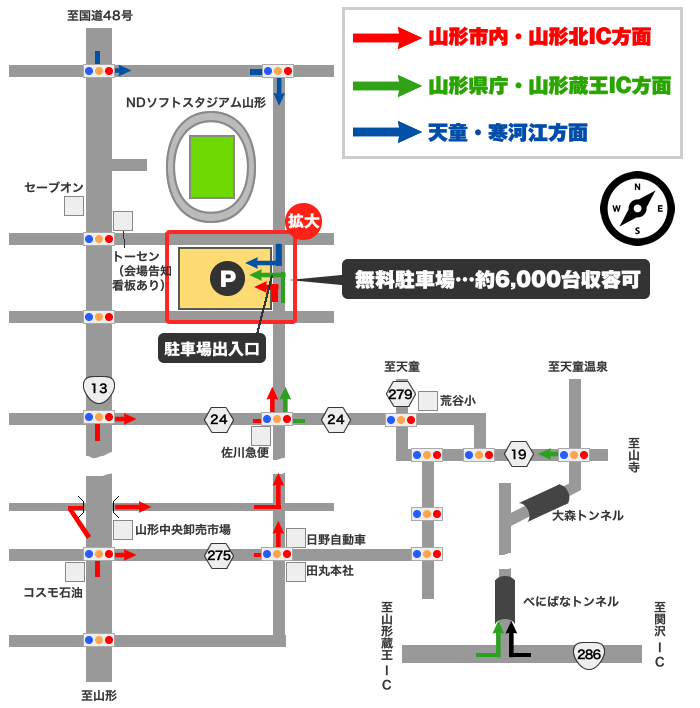 また駅からスタジアムまでの経路案内などもしておりませんので、できるだけJR山形駅またはJR天童駅をご利用下さいますよう、お願い致します。