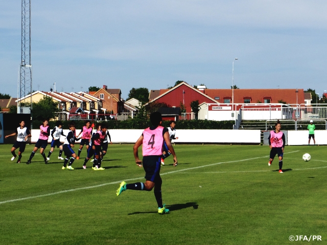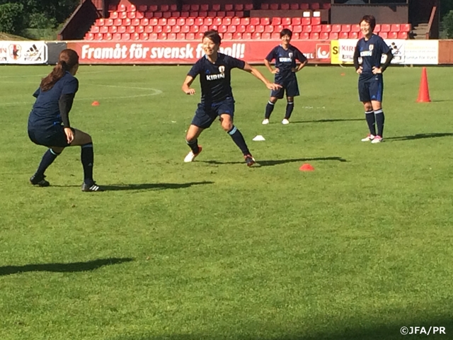 スウェーデン女子代表との試合が行われたカルマルから約200km離れたスウェーデン南部の都市・クリシャンスタッドには前日に移動。23日(土)の午前中は予測を伴うステップワークのトレーニングからスタートしました。その後3対3+2サーバーのトレーニング、パス&コントロール、最後は7対7のゲームで汗を流しました。午後は攻撃と守備に分かれたトレーニングを実施。攻撃はシュートをメインに、守備はラインコントロールからクロスの対応、ゴール前の攻防を中心としたトレーニングを行い、最後は紅白戦で翌日の試合に向けた最終確認をしました。