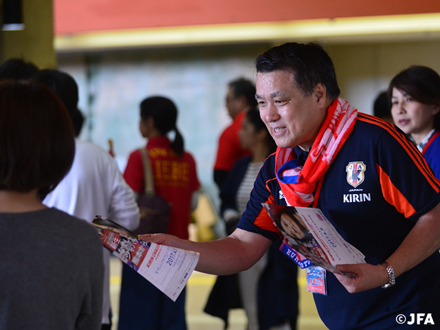キリンチャレンジカップ2017に向け、JFA田嶋会長自らが熊本でチラシ配りを実施