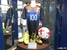 なでしこジャパン 阪口夢穂選手国際Aマッチ100試合出場記念ユニフォームや選手着用シューズなどを展示 【キリンチャレンジカップ2017 〜熊本地震復興支援マッチ がんばるばい熊本〜】 ~日本サッカーミュージアム~