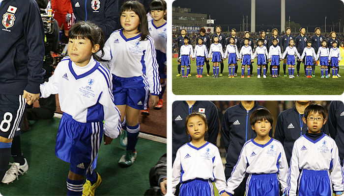 たくさんのお客さんが見守る中、あこがれの選手たちと手をつないでピッチに入場します。キックオフ直前のピッチの緊張感を味わうことができますよ。