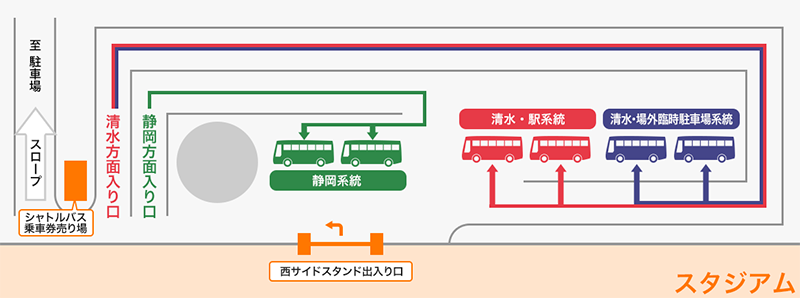 ※入場待ち列整理開始時間(12:00)までにご来場希望のお客様は、JR清水駅東口発シャトルバスをご利用ください。JR静岡駅北口発のシャトルバスの場合、始発でも間に合いませんのでご了承ください。