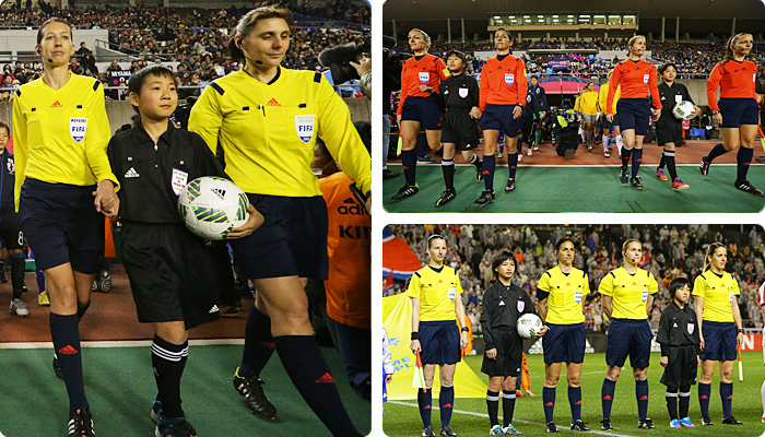 ルールに基づいて、選手と一緒にサッカーの試合を作るレフェリーをエスコートします。また、試合前の大事なセレモニー、両チームのキャプテンを交えたコイントス等のお手伝いをします。