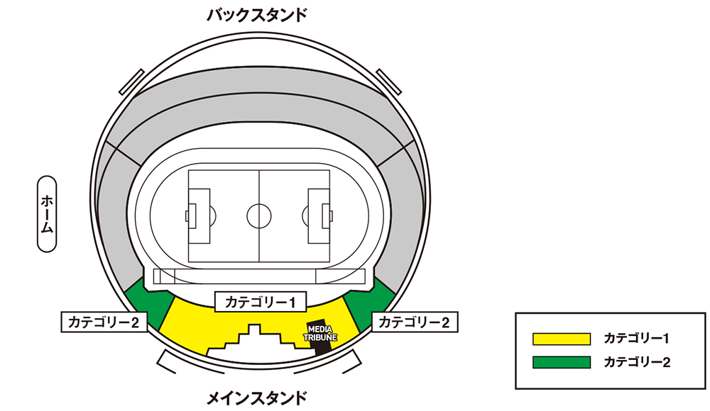 - カテゴリー1メインスタンドの1~3列目は、座席とピッチの間にチームベンチなどがあるため、ピッチの一部が見えにくい場合がありますので、あらかじめご了承下さい。なお、見えない範囲は座席位置によって異なります。