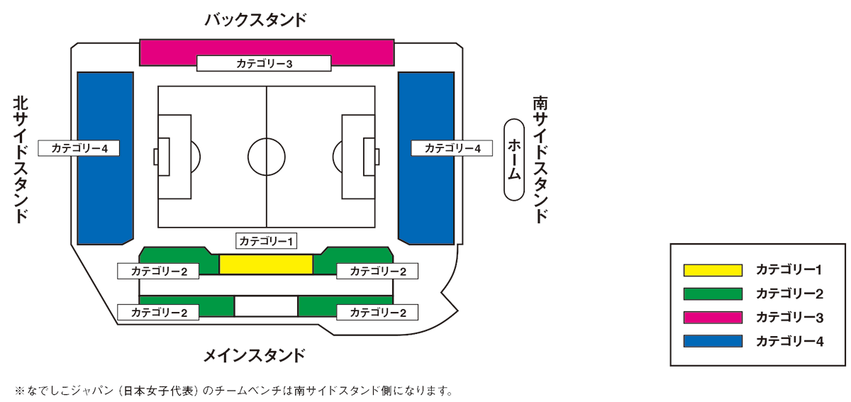 - なでしこジャパン(日本女子代表)のチームベンチは南側です。