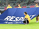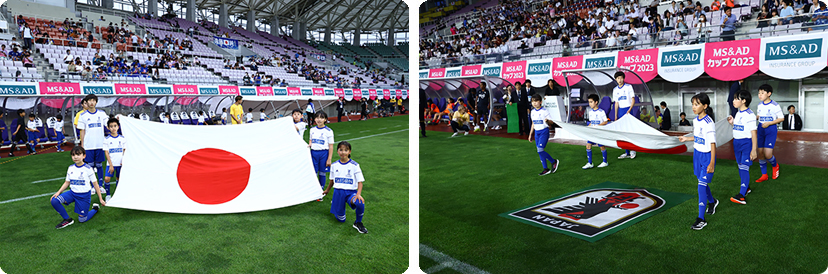 試合前に選手を先導してピッチに入場する国旗を運びます。たくさんのお客さんが見守る中、誰もいないピッチに最初に入場していく緊張感を、選手たちと一緒に味わってください。