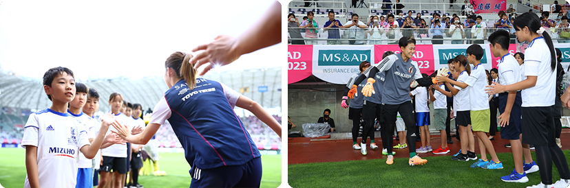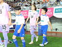 たくさんのお客さんが見守る中、あこがれの選手たちと手をつないでピッチに入場します。キックオフ直前のピッチの緊張感を味わうことができますよ。