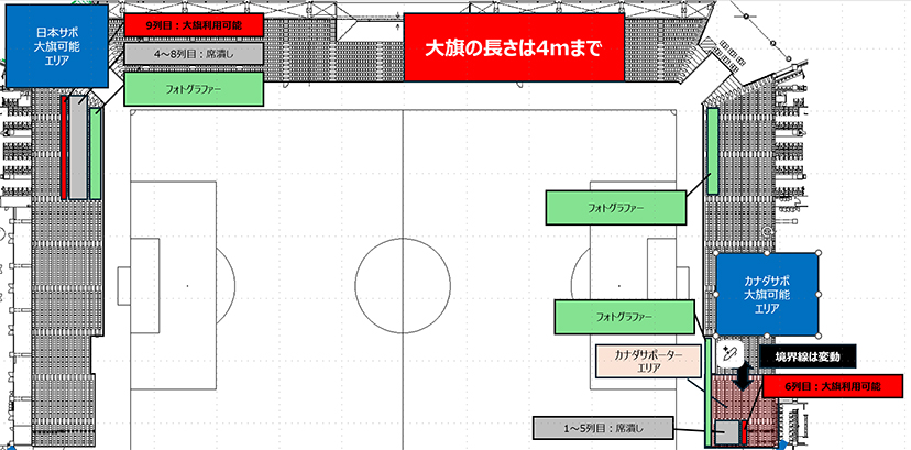 ※Lフラッグのサイズを超えるものや、旗竿が金属など柔軟性のない素材製の旗(大旗を含みます)は、ゴール裏スタンドの指定箇所のみ使用可とします(但し長さは4m以内)。詳細は当日係員までお尋ねください。