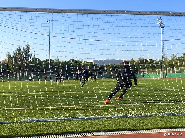 午後のトレーニングは相手ゴールに向かう連携について確認を深める内容となりました。ここでは、連携のための連携ではなく、最後シュートを決めることが大事だと高倉麻子監督、大部由美コーチから何度も指導の声があがります。トレーニングの締めは大会でも予想されるPKを全員が蹴り、決めて気持ちよくトレーニングを終えた選手とそうでない選手で異なるリアクションを見せていました。