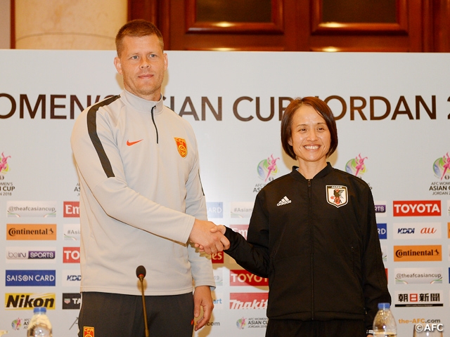 また、準決勝を前に公式会見が行われ、登壇した高倉麻子監督は、「中国と一緒にワールドカップに行けることを嬉しく思います。これまでアジアを牽引してきた仲間である中国はタレントの多い強敵で、グループステージ同様厳しい戦いになりますが、自分たちのサッカーに集中して戦って勝利を収めたいと思います」と話しました。対する中国女子代表のエイヨルフソン監督は昨年末に日本で開催されたEAFF E-1サッカー選手権直前の11月に中国女子代表の監督に就任。「チーム状況を把握しきれていなかった当時に比べてチーム力は上がっている」と話します。会見後は両監督が握手を交わして健闘を誓いました。
