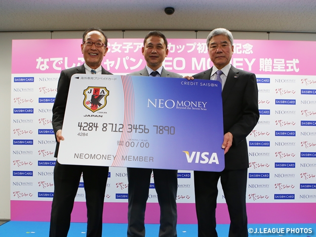 なでしこジャパン(日本女子代表)のAFC女子アジアカップ初優勝を受け、大会登録メンバー25名に日本代表サポーティングカンパニーである株式会社クレディセゾンより「NEO MONEY」が贈呈されました。「NEO MONEY」は日本初の海外専用プリペイドカードで、サッカー日本代表デザインのカードに20万円がチャージされ、プレゼントされます。12月25日には贈呈式が行われ、出席したなでしこジャパン 佐々木則夫監督は「サンタクロースがやってきました。この贈呈を、各選手が自分自身の強化につなげてほしい」と語り、2015年のFIFA女子ワールドカップに向けた抱負を語りました。