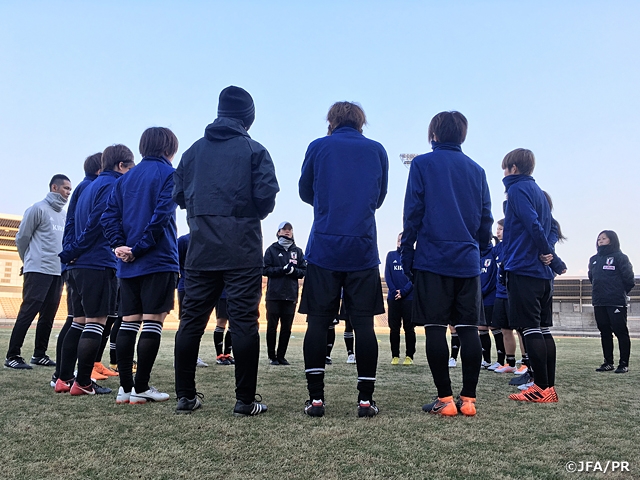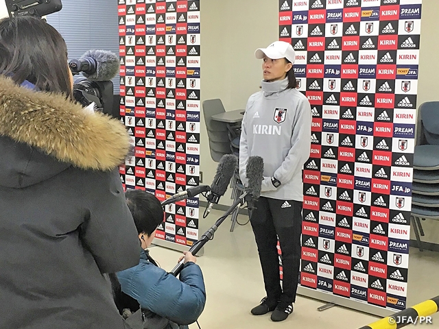 高倉監督はトレーニング後の取材で、「とにかく成長しながら、力強く戦っていきたい」と話し、夜のミーティングでは4月のアジアカップまでのスケジュールをホワイトボードに書き出し、「これからの与えられた時間でしっかりやっていこう。アルガルベカップで対戦するチームはいずれもヨーロッパで力をつけているチーム。この大会でタイトルを狙い、その先のアジアカップではディフェンディングチャンピオンとして、連覇を狙う。その気持ちを持って練習から取り組んでほしい」とチーム全体で目的を共有しました。