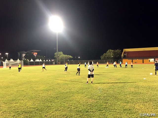 翌14日(火)から本格的に活動を始めたなでしこジャパンは、2日後の16日(木)に迎えるタイ女子代表との初戦に向け、午前は移動で硬くなった体をほぐす程度に軽いエクササイズで汗をかくと、夕方に本格的にトレーニングを行いました。日も沈み気温も下がった19:00からのトレーニングでは、パス&コントロールなどの基礎的なメニューで日本とは違う芝生を確認しながら、攻守グループに分かれて約束事の確認や理解の共通化をはかり、最後はゴールを4つ置いた形の9対9のゲーム形式で締めました。