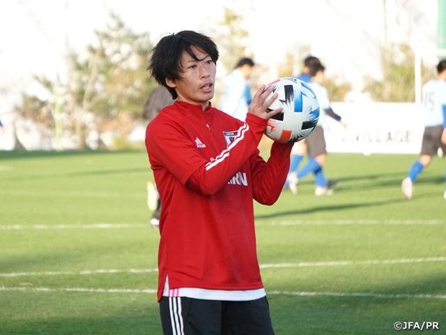 守備のところでは自分がボランチをしているときや、中盤から前の選手にどう追い込んで判断して指示を出すことを所属チームでも意識して取り組んできました。ビルドアップで前の選手にぶつけるとか、ポジショニングの修正とか、意識してきました。前回の活動から時間が開かないので、前に取り組んだことすぐに取り組めていますし、コミュニケーションの面であったり、このチームに馴染むというところでは前回よりできていると思います。時間をおかずに活動ができていて、前回の活動とはメンバーも違いますが、同じコンセプトを積み上げられていると感じています。個人的な課題であるビルドアップ時に前を向くことや、前線の選手にパスをつけるというところや、ミドルレンジのシュートも少ないので、そこは取り組んでいきたいと思います。