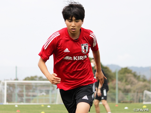 初めてなでしこジャパンに呼ばれて、最初は正直すごく驚きましたし、緊張しましたが、先輩たちがいい雰囲気を作ってくれて、楽しくサッカーに取り組めています。まずはここで自分の力がどこまで通用するのか試してみたいと思います。4月には代表戦が2試合控えていますが、もちろん選ばれて、代表デビューして、日本を背負って戦いたいという思いはすごくあります。このキャンプでは、自分よりも何段階も上手い選手がいる中でやっていて、今はまず少しでも自分のレベルアップのためにと思って頑張っています。トレーニングで、普段一緒にプレーしているチームメイトは色々と分かっているのですが、他チームの選手から新たに学ぶものが多いです。持ち味のドリブルで1対1を仕掛けるところは引き続きトライしていきますが、これまであまり意識できていなかった守備のところはもっと取り組まないといけないと思っていて、他チームの選手からは特にその点で盗みたいと思って意識して見ています。先輩たちからは、なでしこジャパンの試合はアンダーカテゴリーの試合とは全く別物と聞いていて、そういった相手と戦ってみたいという気持ちは強いです。自分がどこまでできるか、そして、できなかったときにはその後どれだけ修正できるか、慣れることができるか、対応できるか楽しみです。