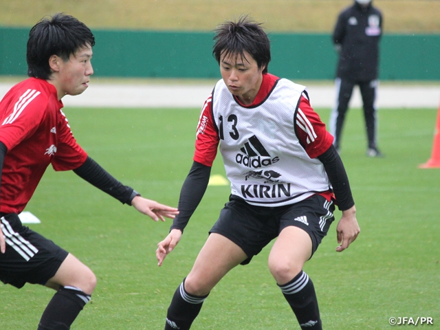 今回は木下選手や浜野選手が加わって、他にも若めの選手が多いですし、しっかりと自分の力を出そうと積極的にトライしているのでチームとして勢いがありますし、いいトレーニングができています。久しぶりの活動で、チームとして積み上げるべきところを積み上げて、個人としてはまず守備をいちばんにチームとしての連携を高めていきたいです。普段より長めに活動できるので、細かいところを追求していきたいと思います。4月の試合に向けて攻守の課題を全員が理解しながら取り組めていると思います。久しぶりの試合なので、チームでトライすべきものをトライして、ミスも出ると思いますがそれを苦にせずにチャレンジしていきたいです。自分も若いと言えないくらい年下も代表に入ってきているので、年齢とか関係なくチームの中心となれるように、自分から発信して、要求して、センターバックというポジションでもあるので声がけしていきたいです。いずれは熊谷選手を超えられる選手になっていきたいですし、そうでないとなでしこジャパンが強くなっていけないと思うので、もっと自覚を持って取り組んでいきたいと思います。世の中がこのような状況の中で活動ができているのは、いろいろな人の支えの上に成り立っていると思うので、本当に感謝しています。サッカー選手として自分に何ができるか考えたときに、プレーで感謝を伝えることだと思っています。今シーズン始動してからもやるべきことをやってきたつもりなので、オリンピックに向けてこのまま全力で取り組んでいければと思います。