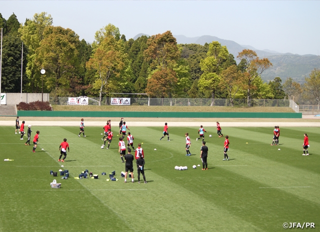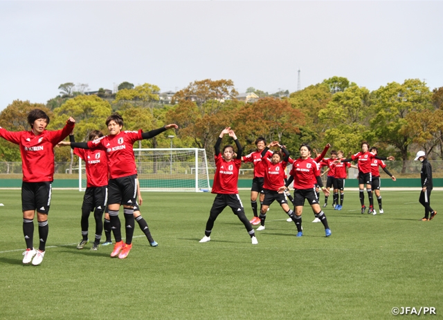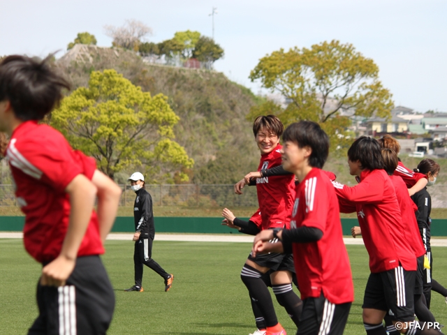 聖火リレーがスタートして、いよいよ東京オリンピックに向かうんだと、私たちにとっても勇気づけられたり、力をもらったシーンでした。なでしこジャパンが第一走者ということで、2011年のワールドカップ優勝シーンや私たちが歩んできた道、さらには先人たちがやってこられたことがすべてつながって今があるんだなと感慨深かったです。第一走者を務めた選手や元選手が堂々とスタートを切ってくれて、私たちも頑張ろうと確認した一日になり、とても嬉しく思っています。選手に対して自分の過去の経験をもとに昔の話をしても、今の選手たちにリンクするものもあればしないものもあります。女子サッカー自体がスピードアップして、パワーアップして、サッカー理解が進んでいて、私の時代に比べると今は数段レベルが上がっているので、昔は昔はと話すよりは、東京オリンピックに向かう限られた人数の中に選ばれていることに対して喜びを感じたり、誇りに思ったり、責任を感じたり、自分たちがサッカーを楽しみながら勝利を目指すことで周りに勇気を与えたりすることができるんだという話をします。このコロナ禍で、ありがたいことに昨年10月と11月にキャンプを実施でき、そこでは男子にトレーニングパートナーとして協力してもらったことでかなりチーム力を高められた実感があります。目に見えるアプローチを取り入れて、例えばピッチにラインを引いて5レーンに区切り、守備時には3レーンの中に押し込もうとか、そのためにフィジカルの強度も上げてきたよねという話をして、今までの取り組みをリンクさせました。今の選手たちは多くの舞台を経験してきている選手が多く、初招集の木下桃香選手や浜野まいか選手もアンダーカテゴリーでアジアを勝ち抜く経験をして、なでしこジャパンに来ても物怖じせず堂々とプレーし、良さを発揮しています。選手同士がお互いにリスペクトしていいものを出し合おうとしてくれていますし、ピッチ上でもいい会話ができているので、いい集団になってきていると感じます。これから東京オリンピックの18人という狭き門にチャレンジする彼女たちに対して、何事もネガティブにならずにポジティブなアプローチをしていきたいと考えています。