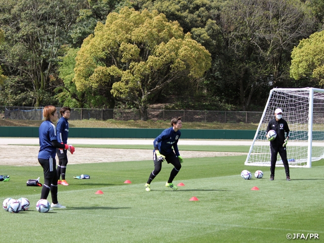 オリンピックの18人に占めるGKの枠は通常2人ということで、この2枠に入るには、監督が「パスサッカーの安定が最大の守備」と言うように、GKであってもフィールドプレーヤーとしてゲームに関与できることが重要です。もちろんGKの仕事としてゴールを守ることが大前提である中で、いかに攻撃に絡めるかがひとつのキーファクターになります。海外に比べると日本のGKはサイズの点で小さいところは否めませんが、「GKができる」だけでなく、「サッカーができる」選手です。フィールドプレーヤーから転向した選手が多く、戦術理解が高いので、実際のプレーには表れませんが、非常に的確な指示をフィールドの選手に送っています。現場で見ると、GKのプレーを「観る」だけでなく「聞く」ことも楽しんでいただけると思います。オリンピック本番では、こちらが主導権を握ってボールを動かした時に、日本の暑さや湿度に不慣れな海外勢が体力の消耗を考慮して守備固めからカウンターを狙う展開になることも可能性として想定しています。その場合に、日本の守備ラインとGKの間に大きなスペースが生まれるので、攻撃を仕掛けられた時に、GKがその広いエリアを守るのか、味方に守らせるか、スペースをいかに守れるかがポイントかなと思います。GKは、自分ができないことをどうのこうの言うのではなく、まずは自分のストロングポイントを発揮し、できることをどこまでやりきれるか、そういうことが大事だと考えています。GK陣には、試合の状況下でテクニックを使い分けているという部分で成長を感じています。その中でも、より良くするためにはどうすべきか、例えば弾くのではなくキャッチできるようにするといったトライも見られます。戦術の部分では、GKだけでは解決しないものが多いので、プレーの合間にフィールドの選手とすごく声を掛け合っていて、より良くするためにどうしたらいいのかコミュニケーションを取っています。ゴールを守る仕事は、最後は個人ですが、そこに至る過程でどうしたらしたらいいのかと改善を図る姿勢が見て取れます。WEリーグの開幕が9月ですが、コンディションも整えてきていますし、総合していい雰囲気でキャンプを過ごせていると感じます。