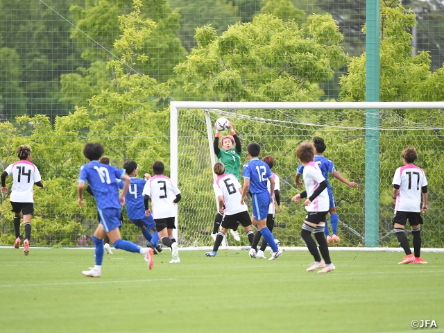 トレーニングマッチもあくまでトレーニングの一環と位置づけているため、互いに不用意なコンタクトや無理をすることは避けつつも、強度の高い展開となりました。前日にもテーマとして取り組んだ守備でも、アプローチの速さだけでなく、相手からボールを奪う強さも随所に見られました。紅白戦とは異なる男子のスピードや強さ・高さに真っ向から対抗するのか、分が悪ければ善後策を講じるのか、的確な判断が求められます。攻撃面でも、一度振り切った相手が追いついてくる、足が伸びてくるといった、まさに海外勢の特徴を再現する男子高校生の守備に対し、頭(判断)と体(技術)をフル回転させながら戦います。