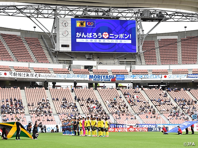 6月の代表戦の試合会場では、試合前に、日本代表の選手・監督・チーム・スタッフ、そして来場頂いた観客の皆様とともに、「医療従事者・医療関係者・エッセンシャルワーカーの方々への感謝拍手セレモニー」を実施しました。キックオフに先立って、約10秒間、感謝の気持ちとエールを拍手で届けました。試合に関わる全員が、大会を支えている全ての方々への感謝の気持ちを忘れず、試合に臨みました。