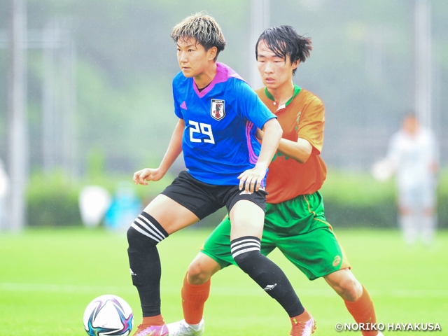 この日もあいにくの雨模様となった千葉県で、期間中3度目となる男子高校生とのトレーニング、そして2度目となるフルマッチを行いました。4-4-2の布陣で臨んだ前回の試合から4-2-3-1に組み変え、GK山下杏也加選手と、南萌華選手と宝田沙織選手のセンターバックコンビがゴール前に鍵をかけ、右の清水梨紗選手と左の宮川麻都選手が両サイドの守備を担います。三浦成美選手とボランチでコンビを組む林穂之香選手の前に、攻撃の要として右から長谷川唯選手、岩渕真奈選手、中島依美選手が並び、ワントップの菅澤優衣香選手がゴールを狙います。