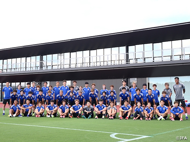 男女両カテゴリーのトップチームが同時に活動を行う稀な機会であるE-1サッカー選手権の期間。この機会を活用し、なでしこジャパンの練習後に男女合同での集合写真を撮影しました。共にJFAアカデミー福島出身であるなでしこジャパンの成宮唯選手とSAMURAI BLUEの小池龍太選手が会話する姿や、他にも親交のある選手同士で挨拶を交わす姿が見られるなど、大会期間中ながら和んだ空気の流れる時間となりました。