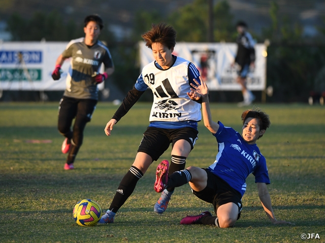 翌14日(火)からスタートしたトレーニングでは、午前は移動による疲労を考慮したコンディショニング中心のメニューとなりましたが、その中でもフィールドプレーヤーはビルドアップからフィニッシュまでを意識したパス&コントロールに取り組み、GKは細かいステップワークからのセービングなど、2日後に控える初戦に向けて頭と身体を少しずつ試合モードへと移していくメニューを消化しました。午後はウォーミングアップを行った後、フィールドプレーヤーは2チームに分かれ、片方のチームにGKが入れ替わりで入りながら、相手がいる状況でのビルドアップの確認を実施。その後、攻撃的なポジションの選手はゴール前でのコンビネーションからのフィニッシュ、守備的なポジションの選手はクロスの守備対応を確認し、最後は再び全選手が合流し、通常の3分の2ほどのサイズのピッチで11対11の試合形式のトレーニングに取り組みました。ゲームは膠着した状態が続く中、最後にMF宮澤ひなた選手がゴールを挙げ、約90分のトレーニングが終了しました。