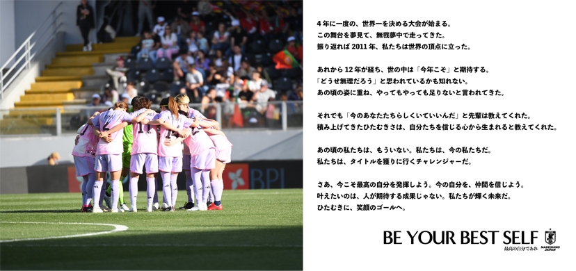 2004年に「なでしこジャパン」という愛称が決まり、2011年にはFIFA女子ワールドカップで初優勝するなど、多くの選手、スタッフ、関係者がそのひたむきさで、数々の壁を乗り越えてきました。その裏側には、それぞれの当時を過ごしたメンバーが、どんなときも自分と仲間を信じ抜き、自分たちらしく挑戦を続けた姿がありました。この「自分らしく挑戦する」ことこそがいつの時代も不変ななでしこジャパンの価値であり、その象徴として人々に勇気を届けることが存在意義であると私たちは考えます。今夏のFIFA 女子ワールドカップ オーストラリア&ニュージーランド 2023、来年のパリオリンピック2024、そしてその先の戦いにおいても、自分たちらしく最大限の力を発揮することで自らが輝き、その姿を見ていただくことで、応援いただく皆さまの心を揺さぶることができると信じています。「BE YOUR BEST SELF-最高の自分であれ-」の言葉を胸に、なでしこジャパンは世界をエンパワーしていきます。