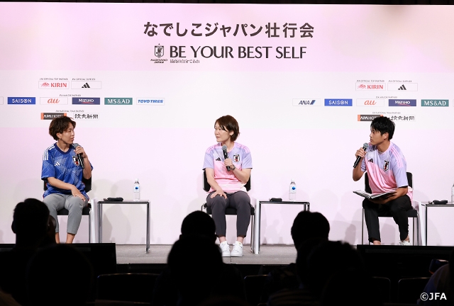 最後になでしこジャパンへのエールとして、阪口さんは「楽しんでほしい。結果はもちろん大事ですが、何よりも楽しんでほしいので、応援しています」と話し、岩清水選手は「選手を目指す小さい子もたくさんいるので、いい見本となるようにひたむきに頑張る姿を見せてほしいです」と、なでしこジャパンの後輩に託した様子。内田さんは「何も臆することなく、後悔のないよう全部をグラウンドで出し切ってほしいです」と、7月22日に初戦・ザンビア女子代表戦を迎えるなでしこジャパンに期待を込め、「なでしこジャパン壮行会-BE YOUR BEST SELF-」は終了しました。