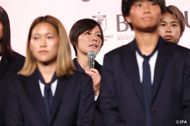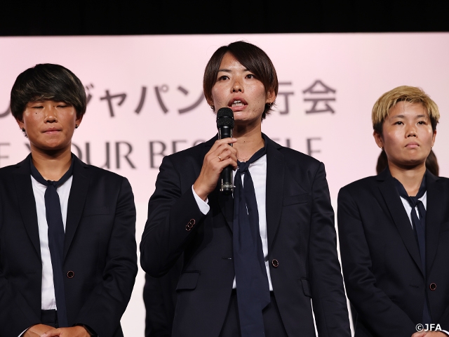 JFAと「サッカー日本女子代表アパレルプロバイダー契約」を締結した株式会社コナカが展開するオーダースーツブランド「DIFFERENCE」の新オフィシャルスーツセットを着用した選手・監督が登壇すると、JFA公式アプリ「JFA Passport」から応募・当選してイベントに参加した方々から大きな拍手。まず猶本光選手(三菱重工浦和レッズレディース)が「今日は皆さんのパワーをたくさんもらって、女子ワールドカップに充電満タンで行きたいと思います」とあいさつしました。
