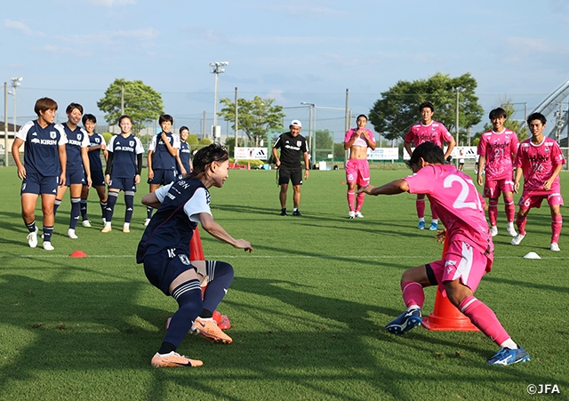 7月10日(月)に仙台入りしたチームは翌11日(火)に二部練習を行いました。午前にシュート練習を中心にしたメニューを1時間弱こなしたあと、午後は仙台大学サッカー部の男子選手との合同練習を実施。ゲーム形式でのトレーニングを中心に、体格や速さ、フィジカルコンタクトに優る相手に対しどのようにボールを動かしていくか、また守備ではスピードに乗った相手に独力での突破を許さぬよう複数人で対応する連係を確認しました。ゲーム形式以外にも攻守それぞれのグループに分かれたメニューに取り組み、攻撃では数的優位な状況で素早くフィニッシュまで持ち込む意識を高めました。