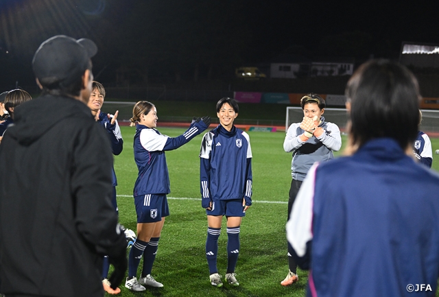 チームは夕方に練習会場へ移動し、スペイン戦に向けた最終調整を行いました。練習前の円陣では、この日に24歳の誕生日を迎えた植木理子選手(日テレ・東京ヴェルディベレーザ)を全員でお祝いし、和やかな雰囲気で練習開始。吐く息が白くなるほど冷え込む中、トレーニングパートナー2人を含む選手たちは念入りに身体をほぐす動きやストレッチを続け、短・中距離のダッシュ。次にボールを使ったトレーニングに移りました。GKの3人は様々な角度からのシュートストップなどを繰り返し、チームは非公開となった冒頭15分以降も練習を続けました。