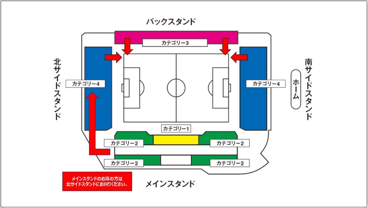 ①メインスタンド → 北サイドスタンド最前列の階段より(コンコースをお回りください)