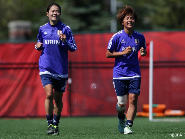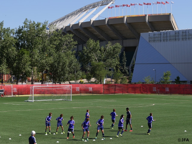 この日、イングランド戦へ始動したチームは、オーストラリア戦で先発した選手たちはリカバリーのためにホテルで調整に努めました。フィールドでの練習には、ベスト4入りの決勝点を決めたFW岩渕真奈選手(FCバイエルン・ミュンヘン)とMF澤穂希選手(INAC神戸レオネッサ)の交代出場2選手と、出場機会がなかった選手たちが参加。前日と変わらない強い陽射しと暑さの中で約1時間、パスワークや切り替えなどを意識しながら実戦形式の練習に汗を流しました。