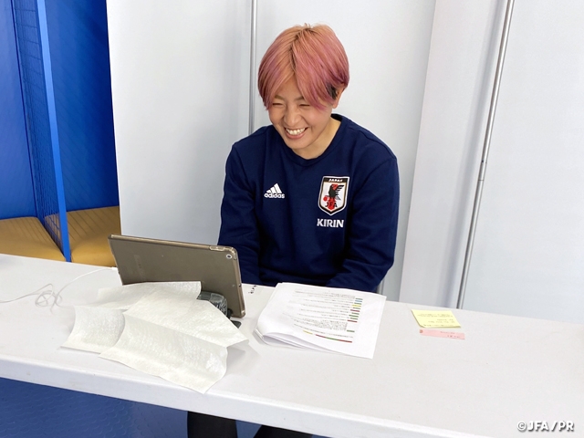 トレーニングはオフとなった午後、池田咲紀子選手、乗松瑠華選手、成宮唯選手、植木理子選手の4名が「なでしこに聞いてみた~番外編~」(小学生とのオンライン交流会)に参加しました。これまでなでしこジャパンの選手の幼少期などを知る企画として、JFA公式YouTubeチャンネルで公開するインタビューを行なってきた「なでしこに聞いてみた」ですが、より子どもたちの知りたいことに触れるため、今回は互いに顔の見える形での実施となりました。参加した14組の子どもたちから次々と質問が挙がり、「サッカーを辞めようと思ったことはない?」という質問に成宮選手は「逃げ出したくなったことはあるけれど、サッカーが好きという気持ちが自分を動かす原動力になって前に進むことができた」と話し、また植木選手は「周囲の人が自分のゴールを喜んでくれる嬉しさを知っているので、そのために頑張ろうと思える」と応援してくれる人が自身を勇気づけてくれていると話しました。乗松選手は明るい空気で全体を盛り上げ、池田選手は自ら子どもたちに声をかけるなど、それぞれが参加者の方々と真摯にふれあいの時間を過ごしました。この模様は、後日JFA公式YouTubeチャンネルでもダイジェストで公開する予定です。
