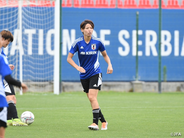 練習後、オンラインでの取材に応じた熊谷紗希選手は、所属クラブであるFCバイエルン・ミュンヘンでの同僚であるセルビア女子代表、ヨバナ・ダムニャノビッチ選手についての質問に対し「常に100%でプレーできる選手。前線でのキープ力もあり身体を使った反転も持ち味で、決定力は高い」と表現し、抑えるべき選手の一人であると語りました。また試合に関しては「日本人同士でやっていたら出てこないシーンが出てくる相手で、その中で自分たちができることを増やしていかないといけない。チームとしてチャレンジしたい部分もあるので少しでも多くそれを出していきたい」と、ヨーロッパの中で勢いを持って成長を続ける相手にしっかり対応することに加え、自分たちの戦い方の幅を広げていくことの重要性にも触れました。また同じく取材対応した田中美南選手は攻撃に関して「1対1や単発な攻撃では難しさがあるので、人が多く関わること、そして相手を抜き切る前でも足を振る意識、シュートレンジを広く持って隙を逃さずゴールを狙っていくことが大事」だと、フィジカルの強さを持つ相手にも果敢に得点を狙っていく姿勢の大切さを説きました。