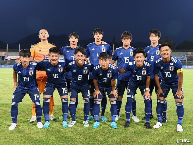 前半終了間際の先制点で硬さの取れた日本は、後半、さらに攻撃のギアをあげていきます。56分には、先制点を決めた上田選手が直接フリーキックを決めて追加点。2-0とリードを広げます。日本はその後もサイドを起点に攻撃を仕掛け、右サイドの紺野選手のドリブル突破に会場が沸くシーンも。紺野選手がピッチを去るときには、会場から大きな拍手が送られました。その紺野選手と交代で入った金子拓郎選手は、出場早々にゴールを決めますが、これはオフサイドでノーゴールに。79分には交代出場の林大地選手がGKのこぼれ球に詰めてゴールネットを揺らしますが、こちらはハンドの判定でまたもやノーゴール。なかなか3点目が奪えません。試合はアディショナルタイムに突入。勝利は確定でしたが、日本は最後まで得点を諦めず90+3分に林選手が放ったシュートが相手DFにあたってオウンゴールに。最後にダメ押しの3点目を決めた日本が初戦を完封勝利で飾り、グループリーグ突破を決めました。