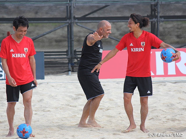 ここまでの合宿では武井敦彦フィジカルコーチによるフィジカルトレーニングが中心でしたが、この日はウォーミングアップ後に5対5の紅白戦を実施。これまで取り組んできた戦術を確認するとともに、一方のチームを“仮想ビーチサッカードイツ代表”に見立て、ドイツ代表との2連戦に備えました。