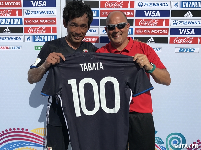 また、今大会のポーランド戦で田畑輝樹選手は国際Aマッチ通算100試合出場を達成しました。ビーチサッカー日本代表での100試合出場選手は、今年2月15日に行われたハンガリー戦で達成した照喜名辰吾選手に続き史上2人目となります。この機会に是非ご覧ください。